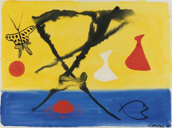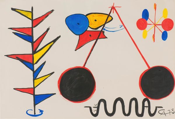 Alexander Calder made this Sliced Lemon painting using gouache in 1963, and what strikes me first is the way he's just gone for it with the brush marks. It’s like he's not trying to be too precious, which I always find refreshing in a painting. There's something wonderfully crude and direct about how the colours are applied, especially the juicy yellow of the lemon against that brushed blue ground. Look how the red shape pushes up against the black circle, and the way he’s left the white of the paper showing through in places – it's all so immediate and playful. That wiggly black line at the top is so nice and simple. He's just having fun with shapes. Calder's like a grandfather to me in that sense, always reminding me to embrace the accidental, to find the joy in making, and to not overthink things.
