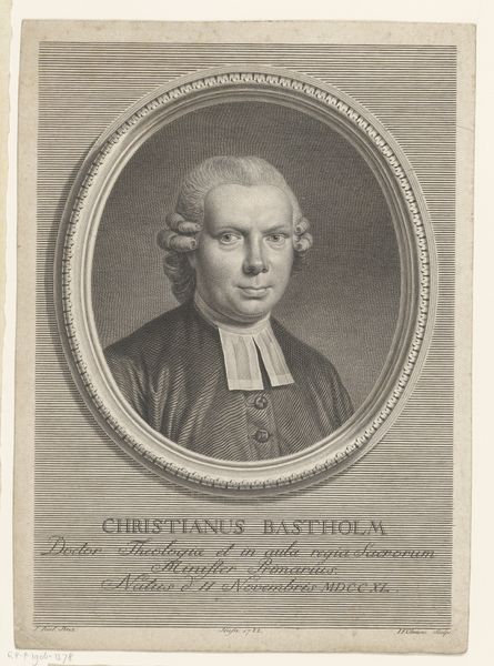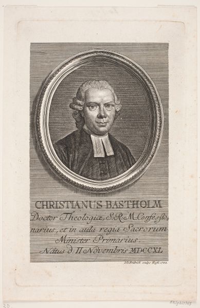 Curator: Here we have J.F. Clemens' 1782 engraving, "Kgl. konfessionarius Christian Bastholm." Editor: The lines! I’m immediately struck by the intense linear detail. It's so precise, creating form out of what is essentially just controlled hatching. The evenness gives it a slightly ethereal quality. Curator: Yes, the meticulous engraving really speaks to the ethos of the period. Clemens chose to portray Christian Bastholm, a Royal Confessionarius, a very important spiritual advisor to the King. Note the oval frame. Such frames often represent an idealized vision. What symbols are highlighted to denote his profession and stature? Editor: It seems as if the focus has definitely been put on him. His clothes are nice enough and not too distracting to the actual portrait. I wonder what paper stock was used? You can see the foxing that happened over time, implying something of its content, fiber, and aging process, like looking at the strata of a career over time. Curator: Indeed. Beyond that, consider how his features, like the almost geometric arrangement of his face, and the wig's careful curls were deliberately placed. These choices create an impression of someone grounded in reason, as the rational classicist ideals of the period preferred. There is order. Editor: To get this amount of detail from a print, it's obvious they would’ve had to have had very fine tools to have rendered this. The work that went into the making suggests he was important to someone. Curator: Engravings such as this allowed for the widespread distribution of images, furthering the dissemination of power, especially in regards to representation. Bastholm, as an advisor and confessor to the King, held significant cultural influence, which I think is visually coded into the medium itself. Editor: Right, seeing that labor actually makes the portrait breathe, connecting it to something deeper about the material conditions that supported artistic expression. Thank you! Curator: Thank you! The convergence of medium and symbol indeed provides a richer view into the cultural moment.