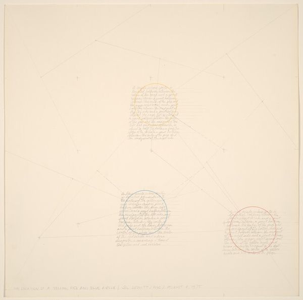 Editor: Here we have Andy Goldsworthy’s drawing "28' Diameter." It’s mostly faint lines on paper forming what looks like a top-down and cross-sectional view of some structure. I’m really struck by how technical it appears, almost like an architectural blueprint. What jumps out to you? Curator: For me, the appeal of this piece lies precisely in what it reveals about the artist's process. Looking at this diagram, the lines and structure speak volumes about Goldsworthy’s method, which normally involves manipulating natural materials in situ. Here, though, it's been translated onto paper, flattening it into two dimensions. Editor: Right, I can see that. So the drawing becomes almost like a record or documentation of his intentions… Curator: Precisely. It reveals the careful planning and material considerations behind these usually transient sculptures. Think about the labor involved in building a 28-foot structure, the materials he is choosing to employ, and how the final product changes and evolves over time due to its impermanent location. Does that shift your understanding of the piece at all? Editor: It definitely does! It reframes my understanding – from seeing the drawing as an end product, to understanding it as a stage in Goldsworthy's wider artistic exploration of landscape and form. Curator: Exactly! The intersection of planning, execution, and materiality are on full display in this work. Editor: This has completely changed how I view not just this drawing but perhaps all preparatory works by artists! Curator: Wonderful, now let’s move on to the next work, keeping this awareness of the interplay of labor and intention in mind.