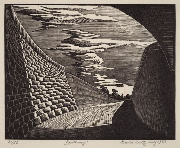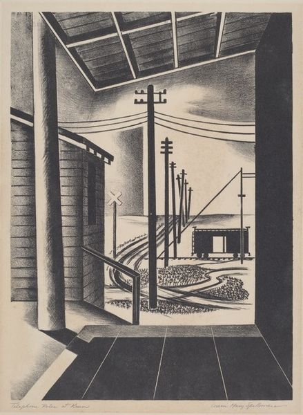 Paul Weller made this lithograph, titled "Lumber and Freight", using limestone and greasy materials to create the print. Weller approached this traditional art process with an eye to the everyday, depicting the built environment of industry. Observe the way the stark materials—lumber, concrete, steel—are rendered through the stark contrasts of black and white in the print. The rough texture of the lumber and the hard edges of the freight cars are captured with the marks of the lithographic crayon. The many individual pieces of lumber, pipes, and bricks give a sense of the labor involved in producing and transporting these materials. The railroad becomes a conduit of capital. In focusing on these elements of infrastructure, Weller asks us to consider the connection between raw materials, industrial production, and the built environment, reflecting on the way that labor and materials shape our world. This challenges traditional notions of what is considered worthy of artistic representation, elevating the everyday to the level of fine art.