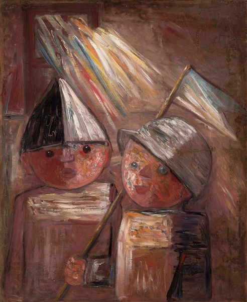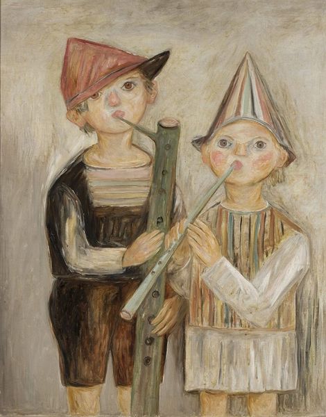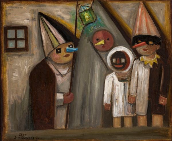 Curator: Tadeusz Makowski’s oil on canvas from 1929, “Children in front of a cage with a canary,” presents a peculiar grouping. Editor: A peculiar grouping indeed! I feel a disquieting air looking at this painting, like a faded photograph from a dream. There’s a muted palette and those children…are they wearing hats? Curator: Those distinctive conical hats immediately suggest an intentional visual language. Consider, children depicted in such a manner appear repeatedly in Makowski's oeuvre— often acting as almost symbolic archetypes within his narratives. Editor: Ah, archetypes. I can see that. It’s like they are these…blank slates, with a child-like, pure view. That Canary looks pretty symbolic to me as well. Curator: Certainly. The canary acts as a traditional symbol for the soul and of vulnerability within confines— juxtaposed against the somewhat homogenous crowd of children— we start to see the composition as an extended allegory. Editor: Allegory! I love it. Perhaps these aren't simply children; perhaps they represent society itself, and the canary is, say, a diminishing form of self-expression or individuality constrained by social expectations? Maybe even something revolutionary, yearning for change! Curator: Revolution can be in the eye of the beholder. While social critique can be argued, it’s more accurate to say his aesthetic aims towards something more personal. Childhood for Makowski, especially towards the latter part of his artistic production, becomes an elusive Eden—corrupted, but nevertheless ever-present as memory and longing. Editor: Oh, I adore that! The longing is palpable, that’s precisely what gives this image its unsettling beauty. Looking at the eyes of the children I wonder if this work isn't only allegorical, but speaks volumes for personal introspection and perhaps a yearning for freedom. The longing is certainly tangible, wouldn't you agree? Curator: Indubitably. The image possesses a starkly quiet poignancy. The symbolic elements contribute layers of interpretation which I find endlessly rewarding. Editor: Me too. There's something very satisfying and comforting in all this interpretation.
