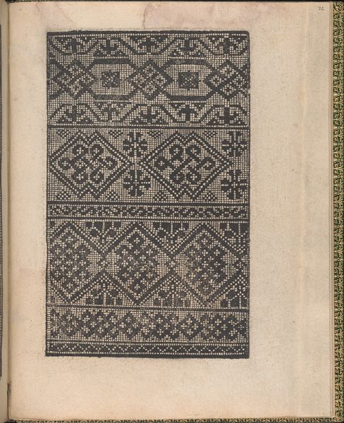 Curator: This is a page from "Le Pompe: Opera Nova," specifically page 11 recto, a book of lace patterns produced by Giovanni Battista and Marchio Sessa in 1557. It resides in the collection of the Metropolitan Museum of Art. Editor: Intricate. I’m immediately struck by the delicacy of the designs, how finely the woodcut is executed. It gives the impression of actual lace, surprisingly light despite the medium. Curator: These pattern books played a crucial role in the social lives of Renaissance women. They provided templates for lacemaking, an essential skill linked to female virtue and domestic economy. The act of creating lace wasn’t just functional; it was a way for women to participate in visual culture, influencing fashion and status. Editor: Absolutely. Think about the labor embedded in this seemingly simple design. Each pattern represents hours upon hours of meticulous handwork – the selection and preparation of thread, the intricate knotting and weaving. This book offered a means of distributing both skill and taste more broadly. These weren’t simply passive instructions; they shaped the agency of female labor. Curator: Precisely! And it speaks volumes about how printed books mediated social behavior. These were not high art, but they circulated widely, informing what the fashionable elite wore and what ordinary women could aspire to create. They exemplify the blurring lines between art, craft, and commerce in the Renaissance. It challenges what we deem important culturally when discussing Renaissance artwork. Editor: I see what you mean about that blending of class through a shared material culture. You have the artist who created the print; and the lacemakers bringing these patterns to life, shaping a more collaborative artwork in a way, each depending on the other. It seems less about expressing pure originality, and more about shared taste across an array of makers. Curator: Right! And looking at the patterns themselves—the repeating motifs, floral elements—they tell us about broader design sensibilities of the period. There’s a language of ornamentation at play here. What can seem simple reveals the material life in a wider context. Editor: Reflecting on it now, what appeared visually delicate hints at a complicated, collaborative construction between printer, lacemaker, gender, and class, something truly material to consider. Curator: Yes, these ornamental prints, despite their seemingly humble status, had the power to shape visual culture and contribute to women's participation in artistic production in the Renaissance. A pattern for the ages.