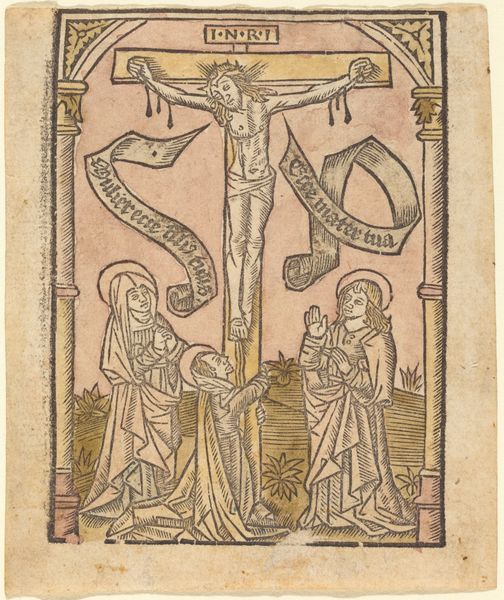 This woodcut with hand coloring, titled *Christ on a Goldsmith’s Cross,* was made by an anonymous artist. Although we don’t know who made this piece, we can consider how it reflects the religious beliefs of the time. The image depicts Christ on the cross, flanked by angels and saints. The sun and moon appear at the top, symbolizing the cosmic significance of Christ's sacrifice. This imagery would have been very familiar in a world where religion was deeply intertwined with daily life. The cross itself is ornamented, possibly alluding to the idea of Christ’s sacrifice as a precious and valuable act. Consider the emotional impact of this image on its original audience. It invited viewers to contemplate themes of suffering, redemption, and salvation, central to the Christian faith. This print serves as a reminder of the profound ways in which art can shape our understanding of the world and our place within it.