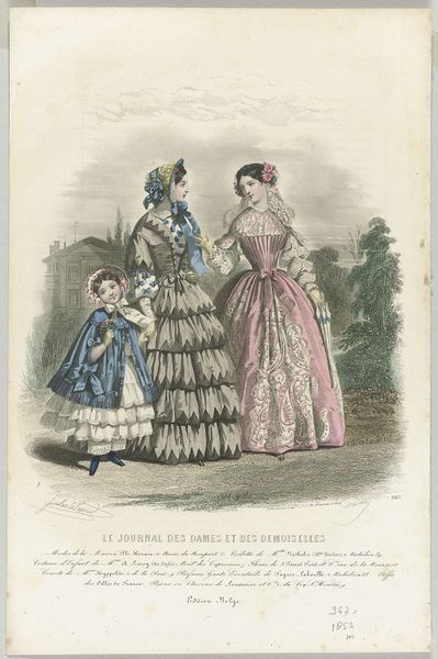 This fashion plate, created in France in 1863, is a lithograph, a printmaking technique using a flat stone or metal plate. The image depicts women's fashion, showcasing the latest styles from Parisian designers. What stands out is the sheer amount of work embedded in these dresses. They are constructed from textiles and trims: labor-intensive lace, precisely pleated fabric, and hand-stitched embellishments. The production of these garments relied on a complex network of skilled artisans, from weavers and dyers to seamstresses and embroiderers. These fashion plates were tools of the fashion industry, designed to fuel consumption and desire. They also reflected the rigid social hierarchies of the time, where clothing served as a visual marker of status and wealth. They remind us that fashion is always deeply embedded in social, economic, and political contexts. These dresses were certainly aspirational objects.