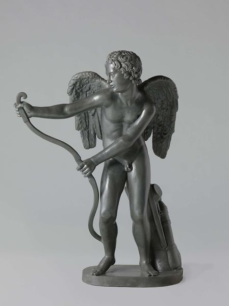 Curator: Here we have Etienne-Maurice Falconet's "The Menacing Cupid," a bronze sculpture completed sometime before 1874. Editor: Menacing is right! It’s surprising—Cupid's usually portrayed as this plump, joyful cherub, but here, there’s something calculating in his gaze, a quiet intensity. Is it just me or is he… plotting? Curator: It’s that finger held to his lips, isn't it? The universal gesture for silence. The allegory here is multifaceted: love, with its delights, also has a shadowy, secretive side. Falconet brilliantly captures that duality. What about the material grabs you? Editor: Well, look at the casting. It’s impeccably done, especially in the rendering of Cupid’s musculature and those delicately feathered wings. And think about bronze itself – a mixture of copper and tin. The labour of extracting the ores, smelting them, creating the moulds...all so different from marble carving, say, and how the message of love gets transformed through production choices. Curator: Yes, this feels less about ethereal love and more about tangible forces and deliberate actions, perhaps because of the heaviness and deep colour of the bronze. It really impacts how the wings are percieved. He seems poised, almost holding his breath. Editor: Exactly. I’m also intrigued by the roses near Cupid's feet—also bronze, yet treated to look almost like gold. That choice feels very deliberate, like a comment on the gilding of romantic love or perhaps its manufactured aspect. Curator: Or maybe a reminder of the sweetness and beauty amidst the potentially harmful mischief of love. But this isn't a one-dimensional morality tale. Instead it’s a recognition that human affairs—particularly love—can contain contrasting ideas. What resonates is the ambiguity of intent in that bronze face. Editor: It sure does gives one pause. Art-making processes have this quality, you know? A physical object which demands an internal process, a shift in our viewing... Curator: Very much so. Every angle gives you something slightly new.