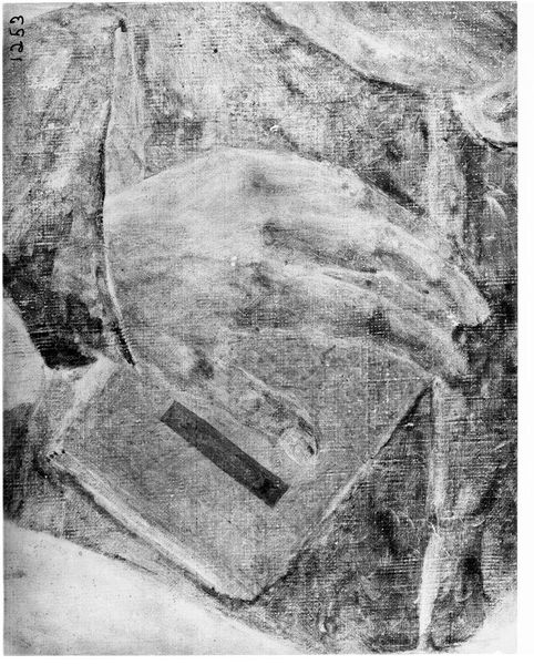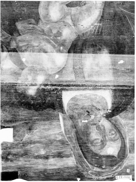 Editor: This is an X-radiograph of "St. John the Evangelist" by Andrea Vanni. It’s quite striking in its ghostly appearance. What symbolic weight can you find in this image? Curator: The X-radiograph allows us to see beneath the surface, revealing the artist's process. The layers evoke a sense of time and memory, echoing St. John's role as a witness. Do you notice any particular gestures or symbols that stand out? Editor: The figure seems shrouded, almost emerging from the unknown. Is that a common motif? Curator: Concealment and revelation are potent symbols, often used to represent spiritual awakening. The hidden layers suggest the mysteries of faith, accessible through knowledge. Editor: It’s fascinating how an X-ray can add another layer of meaning to an already symbolic work. Curator: Indeed, it underscores the enduring power of images to carry cultural and psychological significance across time.