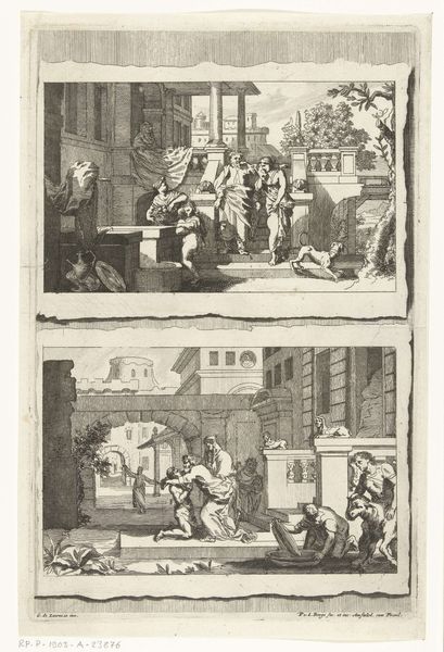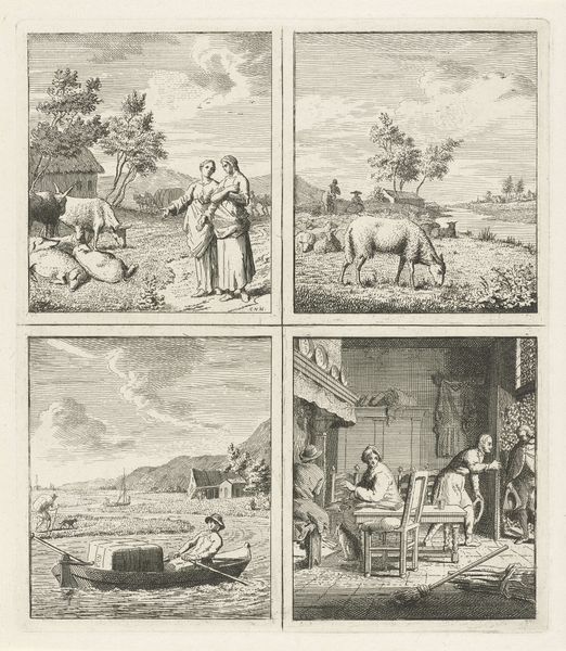 Cornelis van Noorde created this print, "Heerser/Schelpenverzamelaars/Winkel/Oude mensen geven raad aan een jongeman," in the 18th century. The composition, divided into quadrants, invites us to consider the cyclical nature of life's stages and the transmission of knowledge. Note the recurring motif of the elder advising the youth, a theme deeply rooted in human culture, echoing through classical literature and Renaissance paintings alike. Think of Nestor advising the Greek heroes or Socrates guiding his disciples. This passing of wisdom is not merely didactic; it’s a profound connection to our ancestors. This motif transcends its literal depiction. It reflects our collective subconscious yearning for guidance and continuity, and the cyclical return of these archetypes speaks to our enduring need for connection with the past, influencing our present actions and shaping our future.