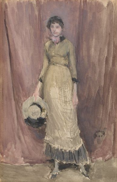 Curator: This is Robert Henri's "The Masquerade Dress," painted in 1911 using oil paints. Editor: It’s arresting. There’s a haunting quality to her direct gaze, and that pale yellow dress seems to glow against the darker backdrop. It feels romantic, almost ghostly. Curator: Indeed. Henri was quite interested in capturing the spirit of his sitters, often portraying them in these kind of posed, theatrical moments. Notice how the costume becomes almost as important as the person. Dresses during this period weren't merely fabric, they were signifiers. Editor: Absolutely. Look at the detail. You can see how the paint is applied in broad strokes, really emphasizing the textures and weight of the fabric. That golden trim at the top and around the arms really pulls the eye and speaks to its precious nature. Curator: And think about the context. Masquerades were social events steeped in symbolic ritual. By entitling it "The Masquerade Dress," Henri is hinting at a narrative, a performance of identity. Who is she pretending to be? Editor: It also forces us to question the labor and materials involved. Someone designed this dress, sewed it, embroidered it—layers of craft consumed for an evening of illusion. Curator: Precisely. The figure, particularly the costumes, become powerful signs with embedded historical and cultural meanings. Editor: I keep thinking about the consumption, the sheer material investment into presenting oneself in this particular way. What does it say about value in the Edwardian period? Curator: A lovely painting to unpack how garments hold meaning. The symbols tell a silent narrative. Editor: Exactly! A quiet and thought-provoking commentary on class and craft. I’m left wondering what sort of work was behind this artwork as well!