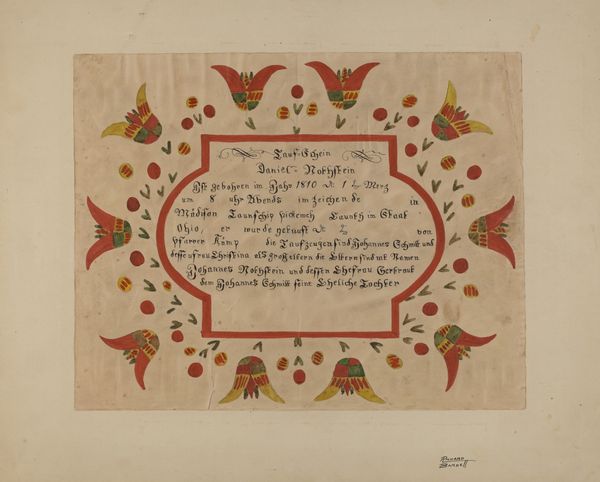 Curator: This piece, "Pa. German Fraktur," comes to us from between 1935 and 1942, crafted by Albert Levone. It's a drawing on paper using watercolor and, it appears, colored pencil. What strikes you about it initially? Editor: It has such a beautiful, quaint aura about it. It feels very much like looking into another world—a world that cherished beauty and faith together, woven intricately. Do you think "aura" is too much? Curator: Not at all. Fraktur is an art form rooted in Pennsylvania's German communities. It's more than decoration; it's intertwined with documentation. Think of it as visual storytelling, celebrating births, baptisms, and sometimes even serving as family records. The text at its heart is not merely text, it’s a history. Editor: I see! So the round frame enclosing the inscription gives it a kind of eternal, sacred feeling. Are the colors chosen randomly? Why so much red, blue and yellow? And why are the objects around the inscription only suggestive of objects? Is there anything about these illustrations that tells the story visually? Curator: Each color, each symbol has its own story in Fraktur. Tulips often symbolize faith or hope, while the circular motifs—like the one encircling the text—can represent eternity. Color choices might reflect personal preferences, regional traditions, or even availability of pigments. It is folk art, so rather than concerning themselves with “hyperrealism” these artist rendered things from memory or feelings rather than photographic references. Editor: Thinking about the level of decoration, would you say this form of expression acted as a visual reminder of community identity, like a gentle push towards collective memory in a world changing fast? Curator: Precisely. These aren't just pretty pictures; they are affirmations of identity, belonging, and faith, passed down through generations. In an ever-shifting world, they anchored communities to their past while blossoming with individual artistry. It’s interesting that the artist who produced it created the art decades after it originally started; Perhaps Levone himself was trying to anchor to the art forms of a bygone era? Editor: It certainly gives us so much to reflect on. The beauty of these Fraktur pieces is that their intimate and detailed nature makes it difficult not to delve deep into the history that bore it! Thank you for your thoughts.