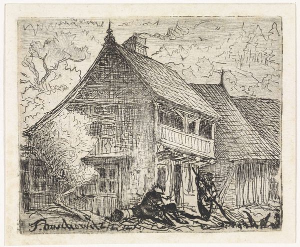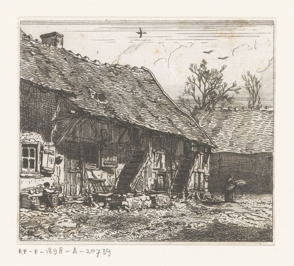 Curator: We're looking at "Huisje te Auschowitz in Bohemen," or "Cottage in Auschowitz, Bohemia," created by Johannes Tavenraat. The exact date isn't known but is estimated to be between 1819 and 1881. It’s a pen drawing in ink on paper. Editor: My first thought is how incredibly dense the marks are, especially on the roof and around the figures. It almost vibrates with visual activity. There's something almost claustrophobic about the level of detail. Curator: The density absolutely contributes to the artwork’s symbolic power. A seemingly simple cottage transforms into a layered representation of life, both solid and impermanent. Consider the repetitive lines of the roof, mirroring the cyclical nature of labor. Even the rough, almost frantic marks in the yard evoke a sense of unceasing activity. Editor: I wonder if that density also speaks to the economic realities of the time, this layering, this pressing-in, especially on what is most certainly a modest dwelling. Bohemian cottages, after all, aren’t exactly known for being opulent. The weight of labor is not only depicted; it’s visually embedded in the very technique of the artwork. Curator: Precisely. Tavenraat creates more than just a landscape; he imbues it with cultural meaning. The recurring motif of shelter, represented by the house itself, points to human’s intrinsic need for safety and community. This motif is constantly reinforced through visual symbols – like the balcony, suggestive of accessibility and interaction – but contrasts with darker undertones like the stark and unwelcoming entrance on the opposite side. Editor: And those dark tones! It feels almost ominous given the context you’ve laid out. The high-contrast and cross-hatching style reminds me of woodcuts meant for mass reproduction. I can’t help but wonder if this style reinforces themes of the common, everyday, and perhaps even…struggle? Curator: It is compelling to consider this as a snapshot of a broader social experience. By grounding universal needs for shelter within a precise geographical and historical context, the artist makes the experience accessible while reinforcing the value of home. Editor: This piece certainly gave me a lot to consider in terms of what the word "home" can encompass. From the daily grind to a deeper need for shelter and safety, its emotional resonance lies within its deceptively busy rendering. Curator: For me, it shows how simple forms can resonate through our shared memories. A familiar image of "home" speaks to the common threads of human existence.