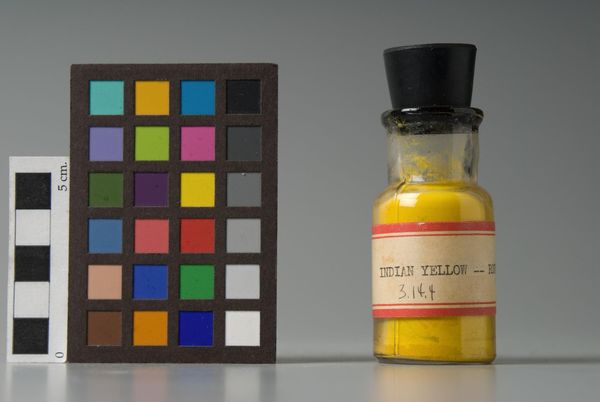 Curator: Here, we have what seems at first glance to be an unassuming object: a bottle of "Transparent Yellow Ochre" manufactured by Le Franc. Editor: It's remarkable, isn't it? The color itself, almost like captured sunlight, hints at something much larger. It makes me think about landscapes, places, identity. Curator: Ochre, as a pigment, has a rich history, used by humans for millennia in cave paintings and body adornment. Its warm, earthy tones speak to a deep connection with the natural world. Editor: And in a contemporary setting, the very act of preserving this pigment in a bottle—it speaks to the commodification of art and the decontextualization of resources extracted for profit. The color swatch next to the pigment brings in the element of industrial color matching. Curator: It's an intriguing paradox: something so historically significant now exists in this very controlled, almost clinical state. This piece makes you consider the life of a color, how meaning and memory can be mixed. Editor: Yes, absolutely. It raises questions about how we assign value and interpret the materials that shape our world, both in art and beyond. Curator: Precisely. It's amazing how much this simple bottle reveals about our relationship to color, history, and even value. Editor: A reminder that even the smallest artifacts can carry enormous cultural weight and continue to shape our perceptions.