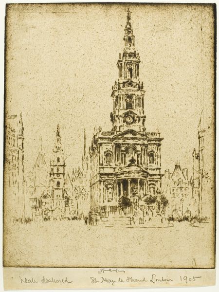 Curator: We’re looking at Joseph Pennell’s 1906 etching, "St. Stephen's," currently held here at the Minneapolis Institute of Art. Editor: It’s so atmospheric! The sepia tones and soft focus give the impression of a memory, slightly faded but deeply felt. There's a definite sense of looming scale too. Curator: Absolutely. Pennell was a master etcher, and this piece beautifully illustrates his skill with the medium. The printmaking process allows him to capture not just the likeness of the building, but the very feel of London at the turn of the century. Think about the symbolism inherent in St. Stephen's itself—a place of worship nestled in the heart of the financial district, Walbrook. It represents a confluence of the spiritual and the material. Editor: Right, and etching is such an interesting choice. He would have laboriously covered a metal plate, probably copper, in wax, scratched the design through it, then submerged it in acid. All that intense labor and skill for an image of commerce and faith mixing on the streets. It’s such a deliberately material and hands-on approach to immortalizing a place. The printing process also lends itself to variation, making each print unique. Curator: Indeed. The church spire piercing the sky, framed by the bustling street below, creates a sense of aspiration amidst the everyday. It’s not just the place; it’s a statement about human ambition and faith reaching upward. Editor: And the city context. The print suggests the impact of modernization on a historical city fabric, how these venerable, old religious structures were getting enveloped by commerce. What does it mean that religion here is caught amongst capitalism's gears? I bet the etching's ink formulation played a huge role, too; that warmth seems key. Curator: An important observation. And Pennell certainly wasn't alone in exploring such themes; there's a current running through a lot of early 20th-century art showing this push and pull of tradition and modernity. Editor: Overall, it strikes me as a beautifully crafted reflection on permanence and change, built out of acid and metal. I am thinking about that materiality more and more. Curator: A fantastic work for appreciating how enduring spiritual symbols continue to tower over our world despite material circumstances, wouldn’t you say? Editor: Absolutely. That’s a great perspective. The work now has taken on another level for me given this deeper consideration of it!