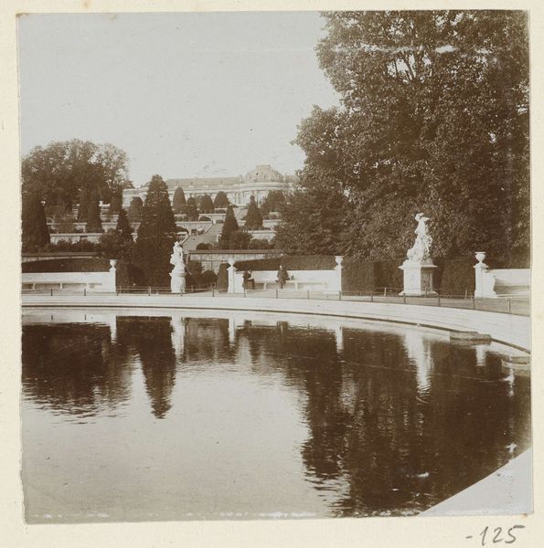 Editor: This photograph, titled "Gezicht op de tuin van het Paleis van Versailles met op de voorgrond de Latone fontein," was taken sometime between 1875 and 1900 by an artist known only as X phot. The symmetry is really striking. What do you see in this piece? Curator: I see a carefully constructed fantasy, a symbol of absolute power made manifest in the landscape. The Latona Fountain is the focal point, and it pulls our eyes along the grand axis of Versailles. How does the fountain itself strike you? What do you think it represents? Editor: Well, Latona was the mother of Apollo and Diana. The figures appear classical... goddesses and gods, or perhaps nymphs? It feels very ordered. Curator: Indeed. The figures reference classical mythology, key in Neoclassical art, representing enlightenment ideals of order and reason. Versailles, in this light, becomes more than a garden, but an ordered cosmos, reflecting Louis XIV's control not only over France but also nature itself. Notice how the landscape amplifies the power dynamic. What cultural memories does a space like this hold, do you think? Editor: I guess, the memory of monarchy, of extreme wealth and power. But also, maybe, of the French Revolution? Versailles seems to hold so much history within its walls. Curator: Precisely. It's a palimpsest of power, a site layered with meaning over time. The photo captures that tension, doesn’t it? Even frozen in time, you can almost feel the weight of history. Editor: That's a perspective I hadn't considered before. Seeing it as a symbol of cultural memory makes me appreciate it so much more.