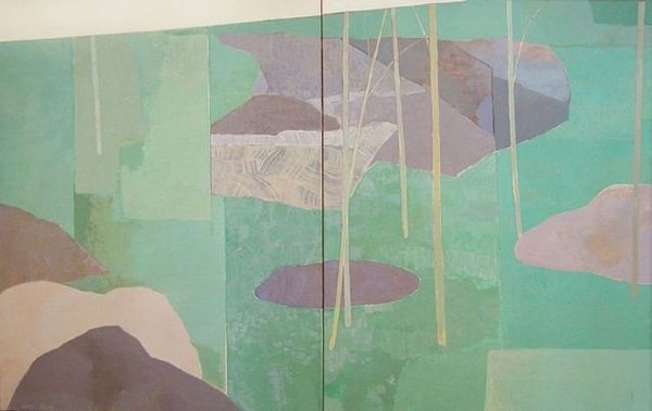 Editor: Alfred Freddy Krupa's "Rapsody in Green," painted in 2022, captivates with its vibrant, almost dreamlike quality achieved through acrylics on canvas. It strikes me as a very intriguing abstract landscape, blending recognizable elements with gestural strokes. How would you interpret this work? Curator: Immediately, the emphasis on line and form strikes me. Notice how Krupa employs a limited, yet potent palette dominated by shades of green, contrasted against the geometric solidity of what seems to be an architectural form reflected in water. Consider how the varying line weights contribute to a dynamic, almost rhythmic composition. Editor: The reflections are quite stylized! It feels less about realistic representation and more about the essence of reflection. Curator: Precisely. Consider how the paint strokes themselves function independently, creating a surface that denies deep illusionistic space. The overall abstraction challenges our conventional perception of landscape, reducing it to its most fundamental visual components. The tension arises between the recognizable motifs of nature and the non-representational energy of the paint itself. What impact does the title have on your understanding? Editor: That's a good question! "Rapsody" makes me think of music. Maybe it is an interpretation of landscape through movement and visual rhythms. Curator: Exactly. Krupa uses color and form not just to depict, but to evoke a sensory and emotional response, much like a musical rhapsody. The overall composition prioritizes visual sensations over literal depiction, and it is rewarding to appreciate its impact. Editor: I'm starting to see how focusing on the structure, and visual elements allows us to explore and grasp this artwork’s message, beyond any narrative. Curator: Indeed, we've moved beyond simply looking *at* the painting, towards actively engaging with *how* it makes us see and feel.
