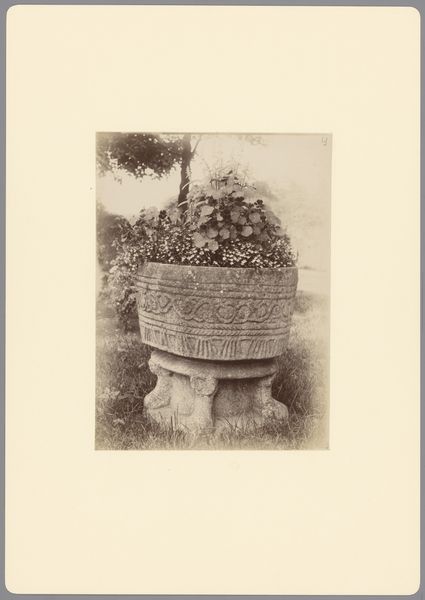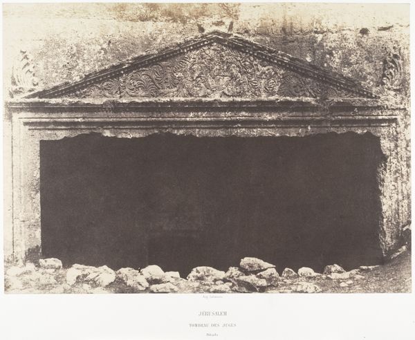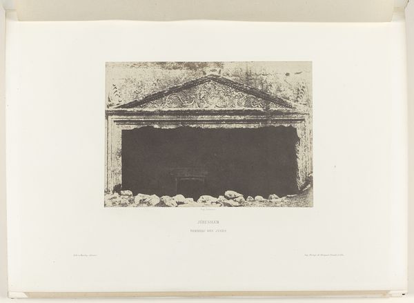 This photogravure of the Greek Convent's fountain in Jerusalem was captured by Auguste Salzmann. The composition focuses on the stark geometry of the fountain, contrasted against the rough texture of the adjacent wall. This juxtaposition immediately presents a play between order and chaos, the man-made versus the natural. The fountain’s form, with its carved reliefs of crosses and vegetal motifs, invites a semiotic reading. The cross, a clear signifier of Christian faith, is set against organic patterns, possibly symbolizing the entwined relationship between religion and nature. The texture – rough stone against smoother carvings – adds layers of meaning. The fountain's clear, geometric lines contrasted with the weathered wall is an interesting relationship that makes you wonder whether it's in decay or meant to last forever. Ultimately, the photograph exists not just as a record but as a careful construction of visual elements. Its starkness and simplicity invite us to contemplate the relationships between form and belief, between the enduring and the ephemeral, and the complex interplay of signs in a sacred landscape.