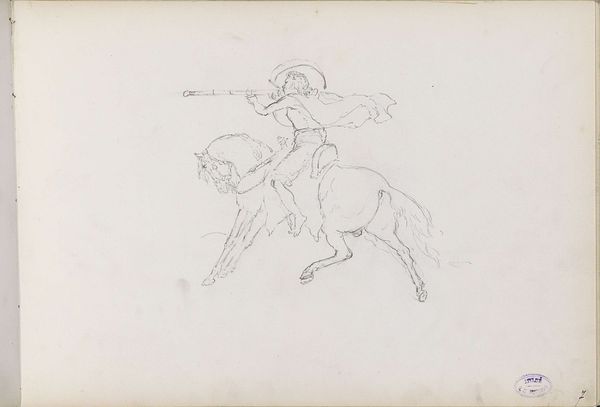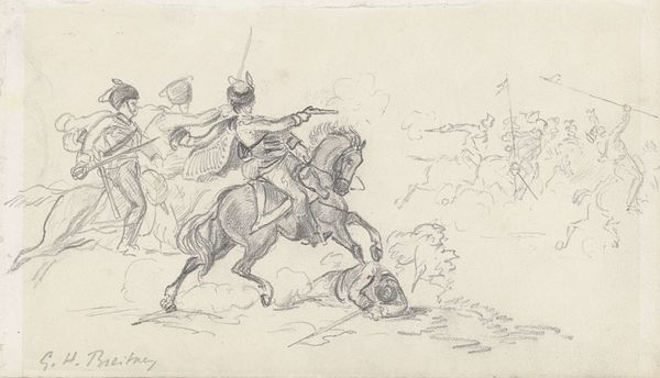 George Hendrik Breitner created this pencil drawing titled "Twee strijdende soldaten te paard" – or "Two Fighting Soldiers on Horseback" – sometime during his lifetime, which spanned from 1857 to 1923. Breitner was deeply embedded in the military culture of the Netherlands, having served as a volunteer in the army. His personal experiences and beliefs shaped his artistic focus. He was particularly interested in capturing the dynamism and intensity of military life, and these themes are clearly represented in his sketch. The artwork offers a glimpse into the gendered and nationalistic dimensions of military culture. Consider the role of men as soldiers, celebrated for their strength and bravery, as well as the concept of warfare as a crucible for forging national identity. Breitner invites us to contemplate the human cost of conflict, and the relationship between individual experience and broader historical narratives.
