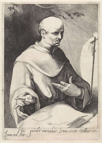 Editor: This is Jan Gerritsz van Bronchorst's "Bust of An Old Man," an etching. The figure looks wise, but also world-weary. What do you see in this portrait? Curator: The stark hatching creates a sense of gravity. Notice the deliberate way the artist uses shadow around the eye and mouth. Can you see how those choices might evoke specific emotional responses? Editor: Yes, it emphasizes the weight of experience. It’s like the image carries the memory of countless untold stories. Curator: Precisely. Bronchorst uses visual cues to tap into our collective understanding of aging and wisdom. An artistic shorthand for life's burdens. Editor: It's fascinating how symbols can transcend time. I hadn’t considered how a technique like hatching could carry so much meaning.
