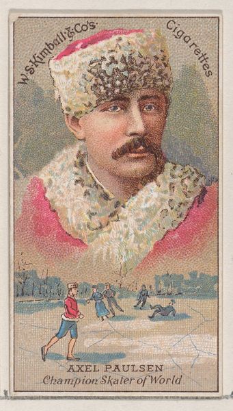 Curator: This card features R. B. Mantel Dressed as Polish General. It comes from the set Actors and Actresses, a series created by W. Duke, Sons & Co. between 1888 and 1890 as a promotional item for Duke brand cigarettes. Editor: It has an appealing directness; it almost looks like a snapshot, doesn't it? The plumed hat, the fur trim, it's all quite romantic and suggests a bygone era. Curator: It’s interesting that this Polish General image was made for an American tobacco company to distribute widely, suggesting an aspirational connection between the consumer, glamour, and ideas about European aristocracy. Editor: Exactly! And that hat—it’s not just decorative. Plumes are powerful status symbols, communicating bravado and honor, reaching back to ancient Rome. It is fascinating how it suggests military prowess. The colour reads almost as blood red. Curator: Precisely. Tobacco cards like these gained huge popularity. But beyond their role as advertisements, they also helped circulate and cement societal values. The choice to depict an actor in costume, and the associated romantic notions of military leadership, would contribute to the idea of ideal masculinity in this time. Editor: Yes. The "general" figure exudes this crafted authority through carefully selected visual cues that resonate across cultures. What I find really intriguing is the theatricality of the portrait. Even in a tiny format, the suggestion is clearly an elaborate performance. The sitter presents themself with the right costume, pose, and a confident, mustachioed visage. Curator: You highlight an essential point, this blend of fact and fiction. Though meant to represent Mantel as a "Polish General," we're clearly seeing a stage persona designed to sell an image, a fantasy rooted in consumerism and imperial ideas about hierarchy. Editor: Ultimately, this tobacco card, at its core, is a beautiful reminder that cultural meaning and symbolic representation in imagery extends far beyond art galleries, but extends deeply into daily life. Curator: Indeed. Examining the humble cigarette card reveals powerful forces that operate far beyond tobacco advertising. It gives us much to consider about art as commodity and cultural mirror.