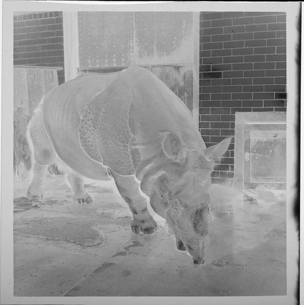 Curator: This is an untitled close-up photograph of a rhinoceros by Jack Gould. Its small dimensions give it an intimate feel. What do you make of it? Editor: I'm immediately struck by the vulnerability captured in this inverted image. The rhino, a symbol of strength, appears almost trapped, its presence both imposing and strangely fragile. Curator: Indeed. The negative presentation is powerful, casting the rhino in an ethereal light. Consider the symbolism of the rhinoceros throughout history; often a symbol of power and even virility. Here, though, that symbolism seems disrupted. Editor: Precisely! The work resonates with contemporary concerns about endangered species and conservation. The unusual framing—looking up at the rhino—might be saying something about perspective and our relationship with nature. Curator: The artist uses light and shadow to question traditional ideas of power. It invites introspection about humanity's role. Editor: It's a powerful statement, prompting us to reflect on our complex relationship with these magnificent creatures.