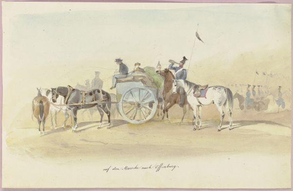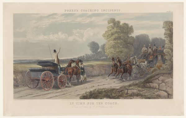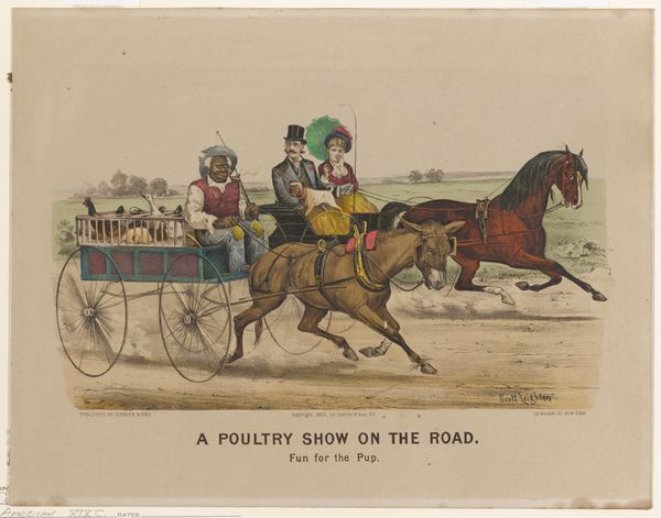 Curator: This delightful print by Thomas B. Worth, made around 1869, is entitled "Fashionable 'Turn-Outs' in Central Park." Editor: Oh, the energy! It's just teeming with upper-class leisure and the almost frenetic activity of… horses. The composition is wonderful, a spiraling collection of carriages. You can practically smell the leather and feel the jostle. Curator: Indeed. Worth captures a slice of life within the newly established Central Park, meant as a democratic space, yet largely defined by class and social spectacle. Consider the materiality, a printed image that’s broadly reproducible. How does that sit against its seemingly exclusive subject matter? Editor: Precisely! The means of production, easily disseminated prints, belies the elitist world depicted. The polished wheels, the horseflesh – these are markers of wealth on parade. Note the contrast with, say, lithographs depicting laborers; same technique, vastly different social functions. What kind of labor goes into crafting the clothes and accessories, too? It all matters. Curator: And the ‘Turn-Outs’ themselves—the equipage, horses, livery—were judged according to strict social codes. A faulty turn-out could mean social embarrassment and demotion of status. This wasn't just a Sunday ride; it was performance. Look at the clothing; a costume meant to telegraph wealth. Editor: Costume is right! Look closely; all that fabric, the top hats. So many manufactured goods coming together in one fleeting, material display. The environmental costs alone! You could analyze an entire industrial revolution from these details, like a fossil preserved in amber. Curator: We're seeing class mobility made manifest, or perhaps fantasized, through display and material possessions. Parks are such potent spaces for these societal negotiations and public performances. What an incisive social commentary conveyed with this artist’s choices in plein air drawing and printmaking. Editor: I think the combination of artistic production and this public display create something worth unpacking. The speed, wealth and class differences are so apparent as we study these people and this art, it's like it hasn't changed.
