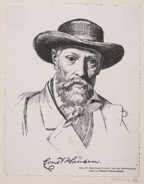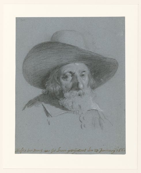 Curator: Here we have a compelling portrait of Alfred, Lord Tennyson by Alphonse Legros. Executed in graphite, charcoal, and pencil, the work embodies a soft realism. What's your initial impression? Editor: Immediately, I see the weariness etched into his face, contrasted with a romantic softness in his flowing beard. It evokes a Victorian melancholia, tinged with privilege, wouldn’t you say? Curator: Indeed. The hat creates a halo, elevating his status while casting shadows that highlight the aging process. In that way, the shadow embodies the psychological weight of reputation and legacy. Editor: Absolutely. Think about the socio-political context: Tennyson was Poet Laureate. This image participates in constructing that mythos, a carefully mediated persona—the pensive, artistic genius sanctioned by the state. Curator: I agree. However, Legros's draftsmanship hints at vulnerability too. The slightly blurred lines, the delicate shading--they humanize the figure. Editor: Perhaps, but even that “humanity” becomes part of the brand. We’re seeing a man consciously curating his image, complicit in solidifying a patriarchal system of artistic validation. How much is the perceived vulnerability carefully performed for his contemporary audience? Curator: A fair point. The symbols here – the beard suggesting wisdom, the relaxed yet composed posture denoting authority, even the artistic medium – all construct a particular narrative of masculine creative power. The portrait memorializes a poet celebrated in his time, capturing his intellectual persona in the late 19th century. Editor: It makes you think about who gets canonized, doesn’t it? Portraits like this one solidified the idea of the "Great Man" of literature, often excluding women, people of color, and other marginalized voices. I think interrogating these power structures and historical portrayals continues to be necessary when studying such works today. Curator: I concur. Analyzing Legros’s portrait through various lenses--symbolic, artistic, socio-historical--allows a deeper understanding of both Tennyson's enduring image and the mechanisms of cultural canonization at play. Editor: Precisely. Legros gives us the "official" Tennyson, but, from a contemporary point of view, the real story may be hiding in plain sight, a meditation on power, image, and the weight of societal expectations.