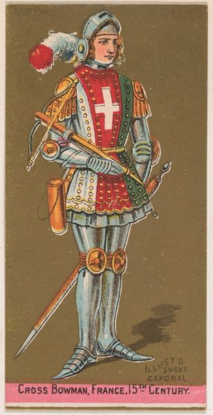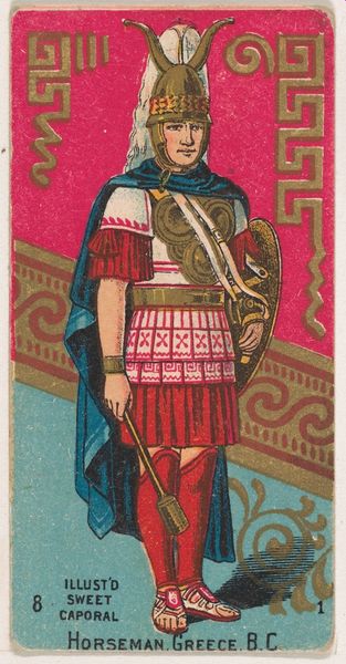 This chromolithograph of a Roman Military Tribune was produced by Kinney Tobacco Company as part of a series to promote Sweet Caporal Cigarettes. It was made during a period of heightened imperialism, when the idea of the Roman Empire was often invoked to legitimize colonial ambitions. This image presents a figure of power, whose authority is visibly coded through his armor, sword, and shield. The portraits on his chest allude to lineage and legacy, rooting his power in the past and classical ideals. The card presents a romanticized and arguably sanitized version of military power. While appearing powerful, it skillfully avoids any direct connection to the brutal realities of military conflict. By circulating images like these, the Kinney Tobacco Company not only sold cigarettes but also promoted a vision of power, history, and identity that resonated with the cultural values of its time. This Roman Tribune stands as an emblem of how commercial art can subtly shape our understanding of history and heroism.