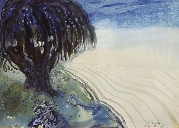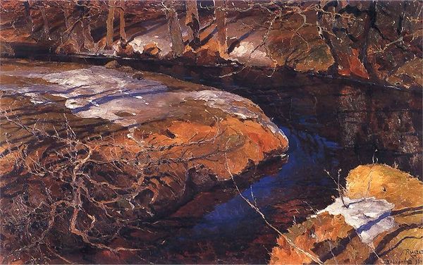 Editor: We're looking at Nicholas Roerich's "Venta. Finland.," painted in 1907. It's an oil painting, and I’m struck by how the cool blues and greens create a sort of melancholic atmosphere. What stands out to you? Curator: The melancholic feel you describe resonates with me. It's important to consider the historical context here. Roerich painted this during a period of intense social and political upheaval in Russia. Do you think the landscape, and especially its somber palette, might reflect anxieties about the changing socio-political landscape and Finnish identity amidst Russian influence? Editor: That's interesting; I hadn’t thought about it in those terms. So, the Finnish landscape isn't just a scene, but also symbolic? Curator: Precisely. Landscapes, particularly those rendered during times of political or social distress, can operate as powerful symbols. Roerich's choice to depict Venta could represent an ideal of stability and rootedness in a rapidly changing world. Also, consider the use of impressionistic and expressionistic techniques. How do these artistic choices enhance or perhaps distort the representation of Finnish nature? Does it mirror a yearning for authenticity or a grappling with cultural identity? Editor: I see what you mean. The brushstrokes seem to emphasize a raw, almost untamed quality. Now, looking at it through that lens, it feels like Roerich is actively making a statement. Curator: Absolutely. Art rarely exists in a vacuum. Investigating these social and historical layers adds immense depth to our understanding. Editor: This makes me realize how much more there is to consider beyond the immediate visual impression! Curator: Indeed, and it’s in these contextual details that a painting truly finds its voice.