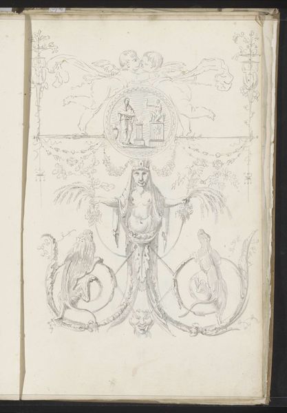 Editor: This pen and ink drawing from between 1820 and 1833 is titled "Tekenvoorbeeld van Romeinse wapentrofee" by Jean Augustin Daiwaille. It's striking how detailed the illustration is despite the fairly limited tonal range of the ink. What can you tell me about its imagery? Curator: It depicts a Roman trophy, a stacked arrangement of captured arms and armor. Consider the context: this was created in a time of rising nationalism in Europe, where images of Roman power and order were politically charged. Daiwaille isn't just drawing a historical artifact; he's evoking an ideal. What does the specific choice to depict trophies tell us? Editor: It seems like more than just an interest in ancient history. Perhaps it’s a glorification of conquest and dominance? Curator: Precisely. And by idealizing the Roman Empire, it implicitly comments on contemporary power structures and their justifications. Think about the ways in which societies have historically legitimized dominance. Note also how masculinity is coded in the work through those trophies, and the suggestion of conflict. Editor: I never thought of it that way. I was initially drawn to the technical skill, but now I see the ideological dimensions at play. Curator: Indeed, its seeming neutrality is precisely what makes it powerful. The “objective” artistic approach to documenting historical artefacts serves to glorify those power dynamics, which echoes through centuries of oppression and colonialism. Editor: So, this image isn’t just a depiction of history, but also a reflection of the time it was made and a statement about power. Curator: Exactly. By examining its historical and political underpinnings, we see it through a much wider, richer context. It makes you wonder what other subliminal stories historical drawings tell.