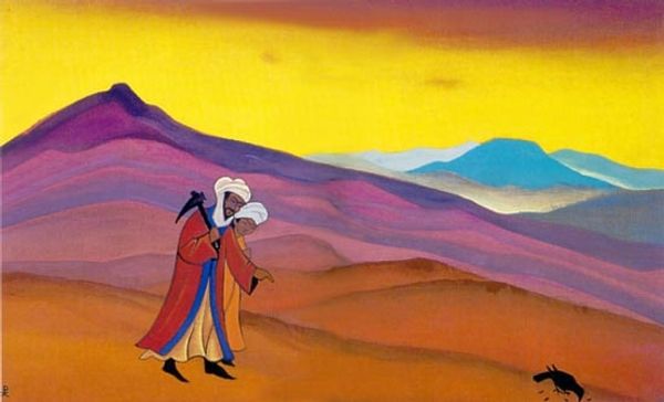 Curator: Nicholas Roerich painted "Iskander and Hermit" in 1938, using tempera on canvas. We're looking at an intriguing meeting between a historical figure and a symbol of spiritual withdrawal. Editor: Wow, the color palette is the first thing that grabs you. Those intense blues of the mountains... they feel so majestic, almost otherworldly. But there’s something melancholic about the hermit's pose; he's shrouded in shadow, while Iskander sits in golden light offering something... perhaps a challenge? Curator: Precisely. Roerich was deeply interested in Eastern philosophy and history. Here, Iskander, a figure often associated with Alexander the Great, encounters a hermit. It raises questions about power versus enlightenment, action versus contemplation, themes consistently present in Roerich’s oeuvre. The contrast isn’t just visual; it’s a dialogue between different modes of being. How might we interpret it through postcolonial studies? Editor: It’s that dialogue that gets me too! Like, Iskander’s offering could be read as, "Hey, check out what the material world has to offer!" But the hermit’s detachment could represent a deeper kind of wisdom. What I wonder is what would a viewer who has never engaged with Eastern philosophy feel? Does this work require a prior understanding to resonate emotionally? Curator: An important consideration. We must be mindful of potential Orientalist tropes. Roerich's vision, while seemingly reverent, also essentializes 'the East' as a space of mysticism and spiritual seeking, perhaps eclipsing the complexities of lived experiences. Does his painting offer genuine intercultural dialogue or reproduce a hierarchical gaze? Editor: It's a tightrope walk, right? Because there is undeniably beauty here. But the layers...the "hermit," the fauvist leanings… you start peeling them back and it becomes a maze of intent. I like that. It's a wrestling match in paint! The tension hangs between those peaks and those figures. Curator: A wrestling match that continues today. In revisiting Roerich, we must question not only his artistic choices, but our own positions as viewers engaged in the perpetual task of meaning-making. Editor: Right, this little painting makes you question all your answers, I like that. Now I’m ready to grab my backpack and head for those vibrant, spiritual mountains!