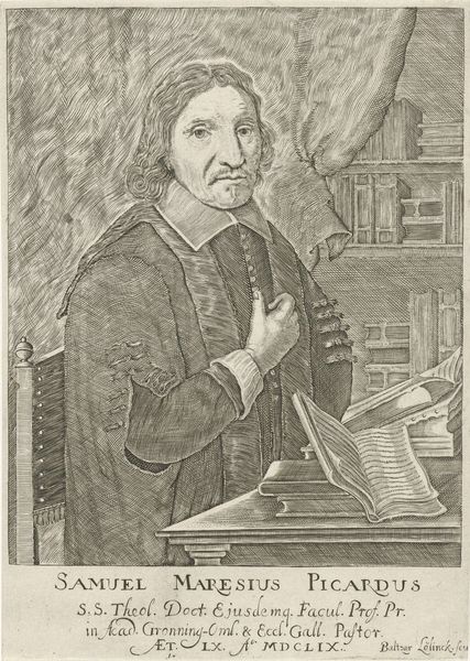 Editor: This is a rather austere engraving, a portrait of Balthasar Bekker from the late 17th century by Anthony van Zijlvelt. It’s a very formal depiction; he’s shown with books, writing... What does this image tell us about how Bekker wanted to be seen? Curator: It’s fascinating how engravings like this functioned almost as publicity. Consider Bekker, a controversial theologian. This image, circulating within a specific intellectual and social network, projects a very particular persona. The books suggest knowledge and learning, placing him within a tradition of scholarship. The act of writing – see the quill in his hand? – emphasizes his role as an active intellectual, shaping thought and contributing to contemporary debates. How do you think that imagery ties to the socio-political context of the time? Editor: It suggests he wanted to be seen as an active member of the intellectual community. The context being the Enlightenment starting in Europe, it feels very much like a play to appear to support this movement. Curator: Precisely. But notice how that representation is carefully constructed. It’s not just about individual intellect, but about projecting an image that reinforces authority and legitimacy within specific power structures, don't you think? It subtly argues for the acceptance and dissemination of his ideas. Consider the power of print at this time - this portrait spreads an idea, more than a likeness. Editor: It is a striking difference that is only made possible by the context. Thank you for opening my eyes to this, it is a unique perspective! Curator: My pleasure! Considering art's role in the political sphere really changes how we view it.