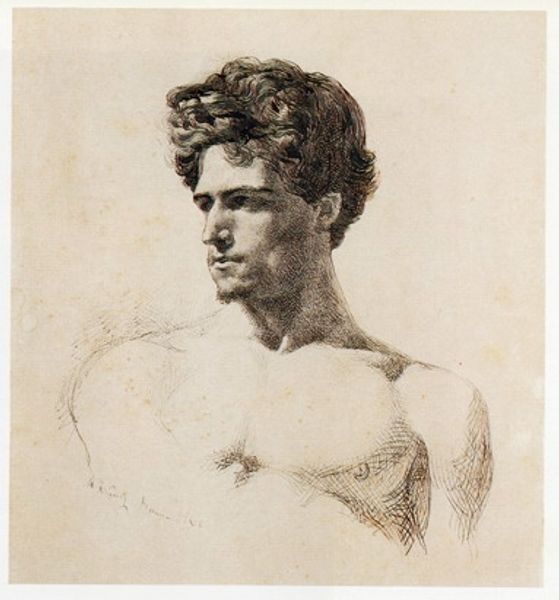Curator: This delicate drawing, "Head and Shoulders of a Man," is attributed to Thomas Cowperthwait Eakins. Editor: It has a very classical feel, doesn't it? The dramatic chiaroscuro brings to mind ancient Roman portraiture. Curator: Indeed. Notice the tonal gradations achieved through subtle hatching and cross-hatching. Eakins, or whoever executed this, masterfully models the form. The sharp contrast of light and shadow focuses attention on the subject's face. Editor: The downward gaze, combined with the shadowed eyes, hints at melancholy or contemplation. It's a very introspective pose. I wonder what inner life is symbolized here? Curator: Perhaps it speaks to broader themes of mortality or the human condition. Editor: It's fascinating how such a seemingly simple sketch can evoke such complex associations. Curator: Precisely. And it shows an impressive command of form and technique. Editor: I agree. A study in light, shadow, and the enduring power of human expression.