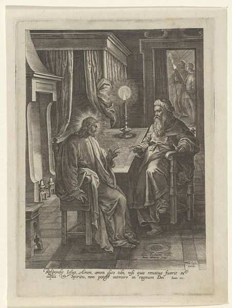 Editor: So, here we have "Procuratoren og Retfærdigheden" - that's "The Prosecutor and Justice" - an engraving from 1760 by Hans Quist. The stark contrast of light and shadow really grabs me. It feels…unsettling, almost theatrical. What’s your take on it? What do you see in this piece? Curator: Ah, yes, unsettling is a brilliant word. Imagine this courtroom as a stage, and Justice herself, floating in, not quite solid. Doesn’t she look rather stern? What do you think she is observing? The heavy tomes on the shelves and the figure of Justice kind of wrestle in my mind—how might we, as a society, reconcile law with morality, book-learning with lived experience? Editor: That’s interesting, because I was so focused on the prosecutor. He looks almost… cornered? He’s got this rather dramatic expression and pose. The books and interior suggest power and order but he's being haunted, of course. Curator: Haunted indeed! Almost a Jacob Marley quality. Perhaps it asks us: can earthly justice ever truly reflect divine Justice? See how Quist uses these incredibly fine lines to create textures? Even the clouds around Justice seem to vibrate. Where do you think justice really exists, in those cloud of ideals or the judge's chambers of law? Editor: I never noticed those vibrating lines. That gives it so much more movement. I’m now wondering, how much is justice really in our hands? Curator: Precisely! It seems Mr. Quist, all those years ago, felt this same tension. That question mark seems embedded right into this artwork. Editor: This has completely changed my perspective on it. The ambiguity makes it much more compelling. Curator: It makes you question everything you previously considered the piece's obvious features and elements. And that's a powerful thing, isn't it?
