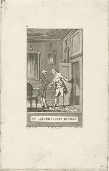 This engraving, "Brieflezende man" or "Man Reading a Letter," was made by Noach van der Meer II in the late 18th century. It presents a scene of domestic intrigue, reflecting the social dynamics of the Dutch elite during that era. The artwork captures a man engrossed in a letter, standing near a window, while a woman peeks from a doorway. The letter suggests intimacy, perhaps even forbidden knowledge. This piece speaks to the gendered roles prevalent in the 18th century, where women were often relegated to the domestic sphere and men navigated the world of business and politics. The emotional tension is palpable; the man’s absorption contrasts with the woman’s furtive curiosity, creating a dynamic charged with secrecy. Does this scene represent a deviation from traditional representations of domestic tranquility, and instead delve into the complexities of desire, power, and knowledge? The artwork offers us a glimpse into a world where appearances often concealed deeper, more complicated realities.