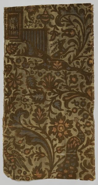 Curator: What a perfectly stunning piece. Our visitors are now viewing "Tulip and Rose," a textile possibly dating back to 1876 and created by William Morris. The work is crafted from mixed media, primarily wool, and exemplifies the spirit of the Arts and Crafts movement here in England. Editor: It has a decidedly tranquil and muted quality to it, despite the vibrancy you would expect from floral motifs. The patterns pull you in and don't let you go, like an endless, calming echo. Curator: Absolutely. The choice of wool points directly to Morris's emphasis on material honesty and his broader socialist ideals. By reviving traditional weaving techniques, he directly challenged the mass-produced, often shoddy, goods of the Industrial Revolution. He aimed to bring art into everyday life. Editor: Looking closely, the repetitive pattern does much more than merely decorate. The intertwining forms create layers within layers and it shows a kind of masterful balance between nature and artifice. Do you notice the underlying structure that holds it all together? The color, too, contributes enormously to the cohesion. Curator: Precisely. And, in viewing 'Tulip and Rose,' we also need to remember Morris's own hands-on involvement in the dyeing process, using natural dyes derived from plants and minerals. This labor-intensive aspect also counters industrial production, embedding social commentary within the very fabric of his work. Editor: The detail achieved through what seems to be careful labor provides such depth and clarity, don't you think? You can almost feel the weave. It’s like looking at a garden frozen in time, each flower and leaf eternally preserved within the warp and weft. It’s a world where color and form work in harmony. Curator: Yes, by merging artistic creation with manual skill and ethical production, Morris not only crafted a beautiful design but proposed an alternative vision of labor and creativity. The repeated shapes suggest mass production, but the handmade process makes each repeat uniquely valuable, opposing the alienation of labor in factories. Editor: The tension is indeed captivating. Focusing purely on the surface aesthetic, the composition offers an array of textures and rhythmic interplay of color. This work transcends mere ornamentation; it speaks of order, and intention within an organic world. Curator: Thank you. Recognizing the intricate link between his materials, labor, and vision allows for a richer understanding of Morris's artistic legacy and of the social agenda underpinning works like this. Editor: And seeing how those elements all fall into place visually grants me a deeper sense of harmony within this remarkable fabric.