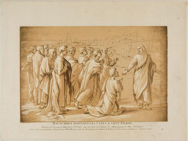 Curator: Claude Mellan brings us "Saint Anne Surrounded by Saints," held here at the Harvard Art Museums. It's remarkable, isn't it? Editor: Indeed. The figures, bathed in a unifying light, evoke a feeling of timeless solemnity. The drapery is almost sculptural. Curator: Note how Saint Anne, centrally positioned, commands attention, her presence radiating both maternal warmth and divine grace. Consider the symbolic weight of the figures that surround her. Editor: Yes, the inclusion of these particular saints – each carrying their own stories and attributes – really enriches the narrative, doesn't it? They each seem to represent different aspects of faith. Curator: It's also worth noting the exquisite texture Mellan achieves with line alone. The light source and the figures' placement create an almost palpable sense of depth. Editor: And the gaze heavenward; there's a deep longing here. Mellan offers a moving study of spiritual devotion. Curator: A masterful print. Editor: Absolutely, an artwork that transcends technique to deliver a powerfully resonant image.