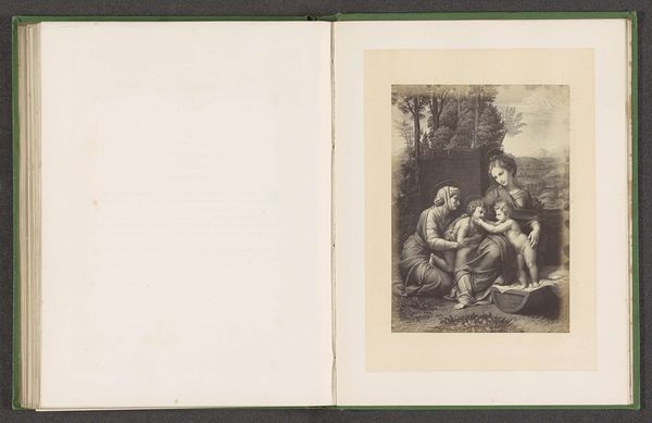 Curator: Here we have a fascinating example of reproductive printmaking, "Fotoreproductie van een prent door Constant-Louis-Antoine Lorichon van de Madonna del Divino amore door Rafaël," dating from before 1869 and attributed to Joseph Cundall. Note the stark tonal range inherent in the photographic printing. Editor: The atmosphere it creates is interesting… almost haunting, isn't it? A sort of nostalgic reverence mixed with the detachment of an artifact long removed from its moment. Curator: Precisely. It's not merely a mimetic exercise; it is a study in translation. Consider how the linear precision of Lorichon’s print renders Raphael’s original brushwork. Now translated via Cundall's lens. We observe a network of visual codings. Editor: It makes me think of the layers of interpretation. Like a whispered story being passed along—each telling shifting slightly in tone and detail. Is the emotional core retained through it all or is something crucial inevitably lost? Look at how tight the framing is—the composition really constricts any feeling of naturalistic depth from the Renaissance era it means to show. Curator: That very tension speaks volumes about our relationship with history, don’t you think? Lorichon aimed to capture Raphael’s idealized grace within the controlled medium of engraving and Cundall then photographs it, adding another layer of objective distancing and yet also a kind of accessibility, a modern lens on antiquity. Editor: It certainly triggers reflections on time and our human need to immortalize beauty… I wonder what Raphael would have made of this ghostly iteration of his Madonna. Perhaps even be fascinated, even tickled? Or totally appalled. I suppose we will never really know. Curator: I would argue that Cundall has provided a unique lens to reflect and to project and not just replicate, challenging us to reconsider the many veils of visual history. Editor: Exactly. Each rendering reveals as much about its own moment, it's maker and how culture reshapes images in a hall of mirrors. What else could art really be expected to do?