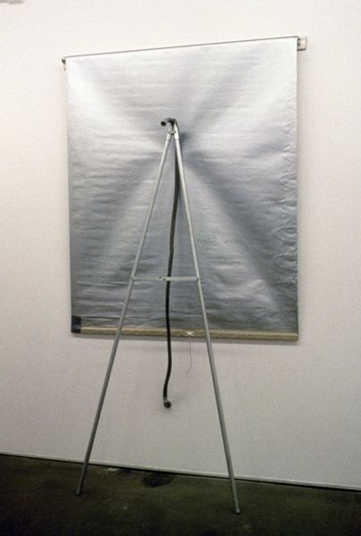 This is Lita Albuquerque's "Sphere of Influence," an installation that uses geometric forms to explore perception and space. The installation is constructed with a minimalist approach. The room is defined by its stark white walls and floor, setting a pristine stage for Albuquerque's arrangement. Dominating the scene are the golden rectangular panels that frame the back and sides of the space, creating a visual rhythm with their verticality. In the foreground, a large, rough-textured sphere sits centrally, contrasting with a tiny metallic sphere placed directly in front of it. The contrast in size and texture draws our eye, prompting reflection on scale and materiality. Albuquerque's choices challenge conventional perspective, creating a sense of infinite space within the confines of the room. The golden panels and spheres evoke a sense of the sublime, inviting viewers to contemplate the interplay between the finite and the infinite. This interplay destabilizes our understanding of space, turning it into a field of limitless possibility.