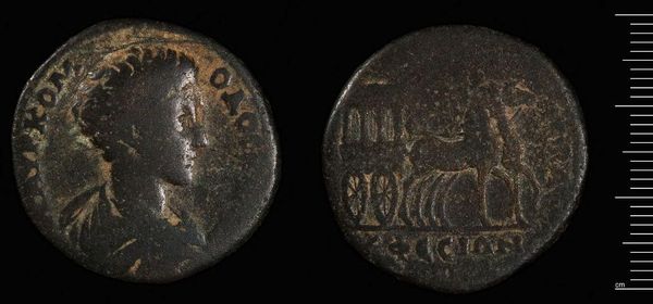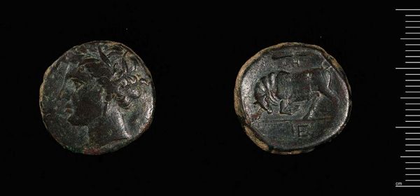 Curator: This is a coin of Cyzicus under Severus Alexander, currently held at the Harvard Art Museums and weighing in at just under 10 grams. Editor: The patina is striking! It speaks of age, labor, and of course, the very ground it was unearthed from. Its form is somewhat degraded, but the design is still legible. Curator: Yes, it represents a tangible link to the socio-economic structures of the Roman Empire, minted in a city then known for its robust trade networks. Editor: I am curious to study the structural balance between the portrait of Severus and the deity on the reverse, its visual language seems almost mathematical. Curator: Indeed, the circulation of coinage like this facilitated not only economic exchange, but also the spread of imperial ideology. The means of production are a key element. Editor: Studying the formal properties and how they work within this small circular space also tells us about ancient notions of power and representation. Curator: I find it fascinating to trace the journey of these coins, from the mines where the metal was extracted, to the hands of merchants and citizens. Editor: And I am struck by how such a humble, corroded object can communicate so much about art, design and the very idea of empire.