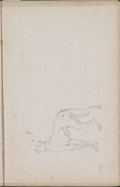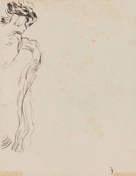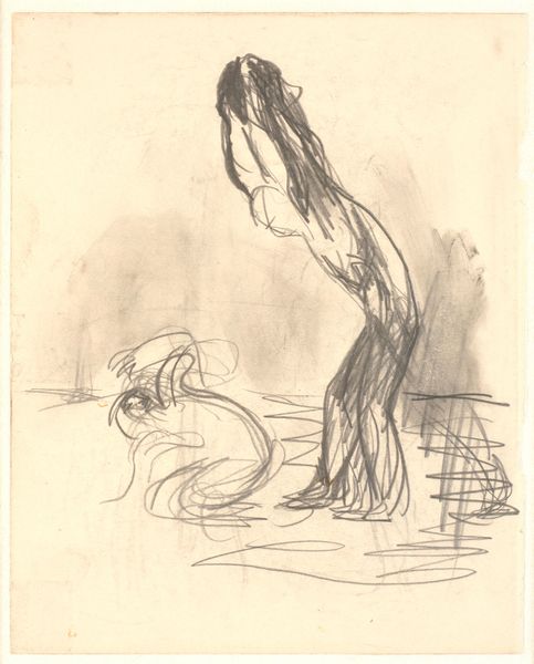 Curator: Oluf Hartmann created this piece, "Samme motiv som recto," between 1907 and 1910. It’s an ink drawing on paper currently held here at the SMK. Editor: My first thought? Melancholy. The stark black ink on the off-white paper gives it an almost ghostly feel. There's a tension, a struggle depicted, and a figure reaching upwards, seemingly pleading. Curator: It's intriguing how Hartmann employed such raw materials—basic ink and paper—to convey that emotion. What specific symbols do you see at play contributing to this? Editor: Well, the animal, or what seems to be an animal, cradled or perhaps strangled, immediately evokes sacrificial imagery. And that reaching figure—is it despair, supplication, or a glimpse of hope? The upward gaze is powerful. Perhaps the symbolism connects with early 20th-century anxieties and yearnings. Curator: Considering the period, think of the growing industrialization and shifting social structures. Did Hartmann, through his art, address the disconnect and spiritual unease many felt then? The materiality suggests accessibility, mass production potential—yet the subject hints at unique suffering. Editor: Precisely! The stark contrast—cheap, readily available materials depicting existential angst. And the ambiguity of the forms allows for a layering of interpretation. It resonates because those emotional experiences, regardless of era, touch upon fundamental aspects of human existence. The lack of a defined setting also contributes to the timeless quality, don't you think? Curator: I do. It almost makes one consider how our relationship to the means of production changes the perception of art and the very value of human labor itself. Editor: Indeed. This work speaks across time through its raw emotionality embedded within the visual symbolism. Curator: An intriguing piece. It forces a deep look not just at the surface, but at the underlying structures and human impact of its era. Editor: A journey into the depths of the symbolic and psychological—and, ultimately, into ourselves.