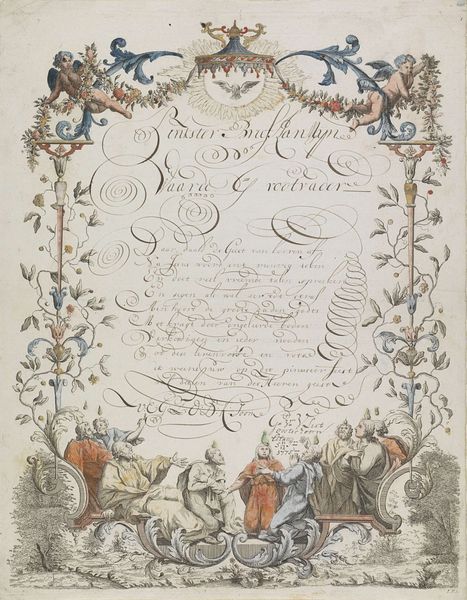 This is a pen drawing by Leonardus Schweickhardt, presenting a "Wish Letter with a Shepherd Protecting His Sheep from a Wolf.” The drawing is structured around contrasting elements: above, decorative calligraphy and symbolic figures evoke a realm of idealized wishes, while below, a rustic scene unfolds. This division creates a tension between the ornate and the practical, the symbolic and the real. Flanking the text, classical figures stand atop marbled columns, framing the central poem with an air of timeless virtue. Below, the landscape introduces an element of raw nature, where the shepherd and his dog confront the wolf, embodying themes of protection and vigilance. The poem, rendered in elaborate script, serves as a bridge between these visual and thematic layers. The drawing employs these formal devices—contrast, symmetry, and allegory—to communicate complex ideas about virtue, protection, and the hopes embedded within the wish letter itself. These were clearly important aspects of the cultural and philosophical discourse of the period.