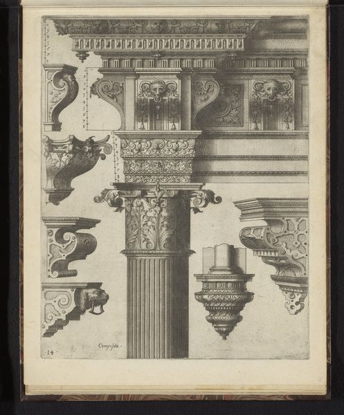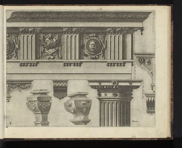 This print, titled "Composiet hoofdgestel, een metope en zeven consoles," was made by Johannes or Lucas van Doetechum using engraving techniques. The work's linear precision reflects the engraver’s skill and the sharp lines of the metal tools used. The image illustrates classical architectural elements, each defined through careful gradations of light and shadow. The engraved lines communicate not only form, but also the texture and weight of stone. Engraving, unlike drawing, is a process of removal. The artist must be deliberate, as each line is etched permanently into the metal plate. This intense focus mirrors the labor involved in the original creation of architectural ornamentation. Prints like this one were critical in disseminating design ideas, making classical motifs accessible for widespread consumption. This piece blurs the line between reproduction and artistic creation, highlighting the skill involved in translating three-dimensional form into precise graphic representation. It invites us to consider how labor and skill are valued across different creative practices.