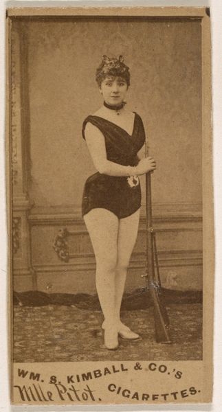 Curator: It strikes me as somewhat haunting. It’s sepia tones lend an air of antiquated beauty, but also of something… lost. It feels strangely disconnected from the gaiety one might associate with an actress from Paris. Editor: We’re looking at "Mlle. Dauville, Paris," one of the trade cards from the Actors and Actresses series (N171) created for Old Judge Cigarettes between 1886 and 1890 by Goodwin & Company, New York. Curator: Trade cards. Right! Marketing ploys from the Gilded Age… Suddenly, this mysterious quality becomes much more comprehensible as a strategic device aimed at cigarette consumption. How clever! Editor: Exactly! The photograph—or rather, photographic print—was strategically used. The Old Judge Cigarettes sought to embed themselves within popular culture and did so using images like this which are now held at The Metropolitan Museum of Art. Curator: The actress, Mlle. Dauville, seems to pose in some outdoor tableau, but that pose feels very… deliberate. She's almost theatrical, if that makes sense, as she leans against a staff, but the effect falls a bit flat. She is at once there, present, yet also rather inaccessibly distant from me. Editor: I’d argue the staged quality, the studied exoticism if you will, sells the promise of a different world. Perhaps Mlle. Dauville, through this portrayal, embodies a life more thrilling than the mundane daily life of the late 19th-century consumer? The slight erotic overtones in the photograph would also reinforce that alluring appeal. Curator: It makes me wonder, did she see much of the profits of these cigarettes. These early advertisements remind me that it's also essential to scrutinize not just the spectacle, but who's paying whom, and who’s being exploited… in the shadows behind the dazzling spectacle. Editor: Absolutely. Analyzing these cultural artifacts is never simply a question of admiring the technique or image—rather, these are also valuable lenses for dissecting issues of production, advertising, and social mores within an expanding capitalist framework. Curator: So, we find a potent, concentrated capsule of historical aesthetics bound up with economics and performance... a complex brew to say the least.