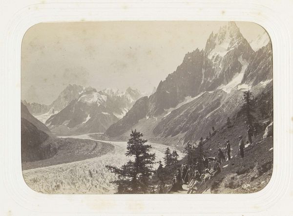 Curator: Samuel Bourne's "Wanga Valley" captures a majestic vista. It evokes a sense of sublime awe, wouldn't you agree? The sheer scale, the contrast between the dark forest and glacial peaks... Editor: Bourne's photography in colonial India certainly intersects with the imperial gaze. His work romanticizes the landscape, subtly reinforcing a narrative of dominion. Curator: Yet, consider also the technical mastery. Bourne lugged heavy equipment to capture these images. The tonal range he achieves, the way the light reflects off the ice...it's remarkable. Editor: And while we admire the technical skill, we must also question its purpose. Who was this image for? What power dynamics are at play in its creation and consumption? Curator: Perhaps it's both. A testament to photographic skill and a product of its time, inviting us to consider its complex legacy. Editor: Precisely. It’s a powerful reminder that beauty and ideology are not mutually exclusive.