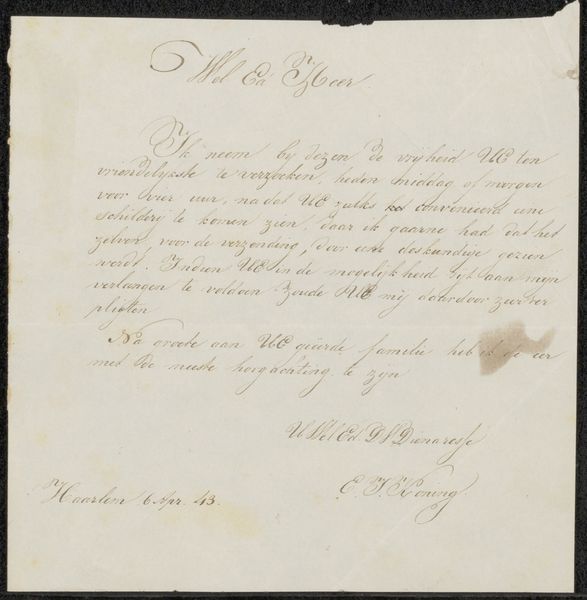 Curator: I see here a letter, titled "Brief aan anoniem" (Letter to Anonymous), created around 1847 by Eduard François Georges. It's ink on paper— a very personal medium for a, well, personal message. What are your first impressions? Editor: It seems so delicate, almost fragile, with that faint ink and aged paper. There’s a sense of mystery because, obviously, we don’t know who it was to, or what it says! How do you interpret this work, seeing past the surface of just being an old letter? Curator: Precisely! It’s tempting to view this simply as an artifact, but we must consider the social context. Letter-writing in the 19th century wasn't merely functional, but a performance of identity. This "letter to anonymous," shrouded in mystery, allows us to explore the power dynamics inherent in correspondence, especially around class and social expectations. It makes me wonder, what was it like to send a message, to address a person without a clear sense of who they might be? What social conditions might encourage one to share one's opinions so ambiguously? Editor: That's fascinating. The idea of letter-writing as a performance is something I never really considered. Is it possible this “anonymous” person was never even meant to receive it? Like a draft? Curator: Absolutely! Think of it as a curated self-presentation, revealing or concealing aspects of oneself depending on the intended reader—or lack thereof. Did the social pressure of letter-writing, including etiquette, encourage people to draft several versions? The act of sending, not sending, and even *reading* a letter are actions filled with political, cultural and gendered considerations, don't you think? Editor: That’s given me a completely new perspective. I was initially drawn in by the aesthetic quality, but it's incredible how much depth is revealed once you start thinking about the social implications and potential audiences. Thanks so much for that point of view. Curator: My pleasure! I feel like that brief chat shows how crucial it is to read images from various intersectional perspectives!