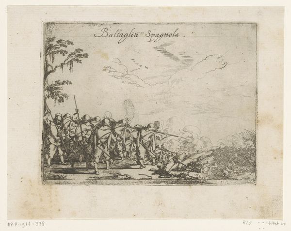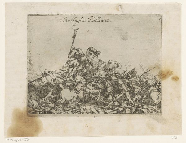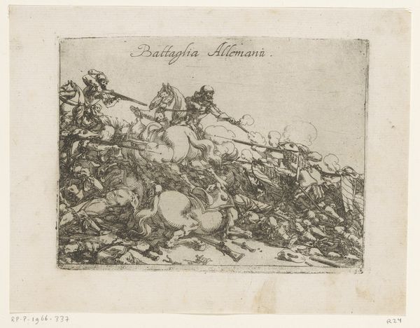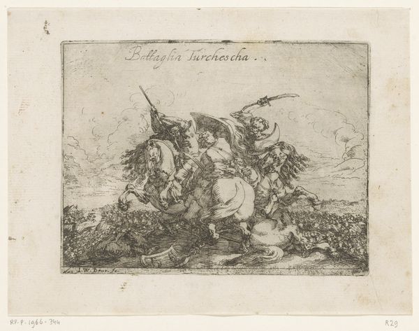 Johann Wilhelm Baur created this etching, "Battle with Indigenous People of South America", in the 17th century. The image is a flurry of lines, densely packed to convey movement and chaos. Light scratches suggest depth, attempting to turn a flat plane into a deep field of conflict. The composition reflects a European perspective on conflict, framing indigenous warfare within established visual tropes. The lines not only depict figures but also seem to enforce a semiotic order, categorizing the scene for a European audience. The emphasis on chaotic energy and the "otherness" of the fighters are key to understanding its cultural coding. Notice how Baur uses line and form to create a sense of disarray and unfamiliarity. The print serves less as a factual record and more as a staging of cultural encounter, filtered through the formal language and philosophical prisms of his time. This artwork functions as a historical document and an ongoing site of interpretation.
