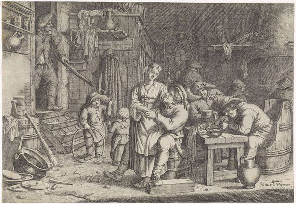 Editor: We are looking at "De Taveerne," which translates to "The Tavern," an early 18th-century drawing by Abraham Delfos, currently housed in the Rijksmuseum. It's created with pen, colored pencil, and watercolor. It is somewhat a dark piece with men engaging at leisure and their focus elsewhere. How do you interpret this work from a formal perspective? Curator: Primarily, my focus gravitates towards the composition's inherent elements. Note the contrasting light and shadow which carve out distinct spatial relationships. The architecture looms in the background and pushes to confine the individuals within its parameters, thereby isolating them. There is a stark distinction of depth that serves to distance. What compositional elements immediately draw your attention? Editor: I am particularly interested in how Delfos uses the pen to capture the textural surfaces. Curator: Precisely! Observe how he employed the pen strokes to give form to texture, differentiating fabrics from flesh and wood, creating visual tactility through artifice. Furthermore, reflect on how the limited color palette emphasizes the importance of line and shape, directing the observer's gaze through this intricate and deliberately crafted pictorial space. Editor: It's fascinating how concentrating on formal components brings out such a complex image from seemingly simple scenes of the Baroque. Curator: Indeed. By appreciating these aspects we decode artistic decisions impacting how a piece speaks. A work's visual language relies on interlocked elements. Editor: Focusing on the visual and theoretical composition opened the work to reveal many underlying artistic applications that dictate and convey a message about isolation despite engagement. Thank you!