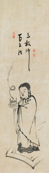 Curator: Right, so, "The Secrets of the Nine Luminaries," dating back to 1125, currently residing at the Metropolitan Museum of Art. It’s by Sōkan. The material listed says it's ink on paper. An old one at that. What do you think when you first see it? Editor: Hmmm…fragile, ethereal. I feel a real sense of history—it whispers rather than shouts. The circular vignette, enclosing a figure…it's contained, meditative, almost womb-like. Curator: The "Secrets" part is key here. We're talking about esoteric Buddhist beliefs regarding celestial bodies and their influence. Imagine these as diagrams for initiates, a visual key to the cosmos. It’s not meant for public display. Editor: A private, portable cosmos! That's cool. It looks like the drawing is so delicate, almost a sketch. What's with all the text surrounding the central image? Curator: Precisely. This piece exemplifies the deeply intertwined relationship between text and image in East Asian esoteric traditions. Sōkan, probably a monk, included ritual instructions and explanations with the image. Editor: It feels like peeking over someone’s shoulder as they're working. Not just visually lovely, but culturally, politically important too. Is this a moment when these specific beliefs about astrology or whatnot were becoming popular, codified? Curator: Definitely. The Kamakura period was a particularly turbulent time. So you see this increase in demand for esoteric knowledge, techniques of self-protection, empowerment – for stability in general. Pieces like this served that exact need. Editor: Self-help meets celestial mechanics. Who knew? The use of what looks like watercolor bleed and coloured pencil…it isn't technically amazing but…well, its vulnerability gets to me. Curator: It really does embody a specific moment. Before everything got streamlined and homogenous. Imperfect as it is, the work breathes, and feels as a lived experience more than a static dogma. Editor: I’m struck now, by the commitment of one human to illustrate their whole understanding of the universe onto a single sheet of paper, trying desperately to communicate it for people they might never meet…there's generosity there. Curator: I agree. Even though “secrets” sounds exclusive, it really is a labor of love in hopes that something helpful will be transferred to others. It reminds us that art can indeed be a conduit for something truly essential, timeless.