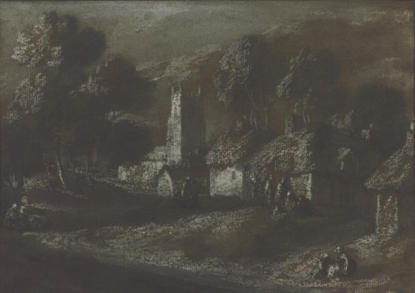 Curator: This is "Wooded Landscape with Village Scene," attributed to Thomas Gainsborough, dating from after 1770. The work combines oil paint with what appears to be gouache on paper. Editor: My first impression is one of hushed tones, a kind of sepia-toned dreamscape. It evokes a profound stillness. Is it just me or is it just terribly depressing? Curator: Perhaps. Gainsborough’s technique, with its loose brushwork and muted palette, contributes to this atmosphere. Notice the layering of tones, how he builds depth not with precise detail, but with an almost atmospheric haze. He wants to construct pictorial space. Editor: Exactly, that pervasive "haze" shrouds everything! While artistically intriguing, its historical context is far from innocent, especially if we look at the rural populations it seeks to depict. We romanticize them, don’t we? But at what cost? What are they doing to sustain themselves and resist exploitation? This isn't innocent; it reflects the idealized fantasies of a leisure class. Curator: While that may be so, it’s the manipulation of light and shadow that is most captivating. The contrast creates visual interest and depth, especially where the eye moves upward toward the village steeple which becomes this dominating vertical form around the tree-lined perimeter. The whole landscape resolves into shape by these internal tensions. Editor: Dominating indeed! An imposing symbol of social hierarchy, if you ask me. And to your point on shape and construction—art historians often ignore class relations in favor of light. Why this focus on structure without understanding the painting’s function for the patron? Why celebrate the “art” of quiet oppression? Curator: Because the surface itself presents a nuanced system of tensions that can be observed across all romantic-era painting. This speaks to the very architecture of image-making. Editor: Maybe for now. But in deconstructing those images, remember to interrogate those systems in relation to those whom it omits. Curator: A sobering counterpoint that certainly warrants more than a passing consideration. Editor: Exactly. The work is artistically accomplished, undeniably. But those aesthetics also tell us stories of marginalization, ones we often conveniently choose to ignore.