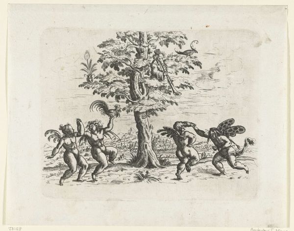 Curator: Here we have a drawing called "Landschap met drie putti die een balspel spelen," which translates to "Landscape with three putti playing a ball game." It’s attributed to Christoph Jamnitzer and estimated to have been made between 1573 and 1610. Editor: The most immediate impression is one of delicate yet playful energy. It’s that very fine line work with such dynamism, it creates this whimsical scene. The contrast between light and shadow is exquisite. Curator: Absolutely. The Mannerist style really comes through. Notice how Jamnitzer uses these classical motifs—the putti, the landscape—but exaggerates the poses and musculature, creating that sense of stylized artifice that's typical of Mannerism. These cherubic figures almost vibrate with contained strength. What do you make of that ball they’re playing with? Editor: From a material perspective, what is the ball made of? The central putto appears to be using some type of inflating device, almost like he's patching up the ball? I am intrigued about what kind of ball game this actually is. Were inflated balls used for games by children in that time? Curator: Intriguing questions! That inflating action gives another layer. One interpretation might link back to classical symbolism – perhaps signifying fortune's mutability or the fleeting nature of earthly pleasures? Consider how inflated or deflated something becomes; consider how desires are filled and disappear. Editor: You bring up interesting psychological ideas. However, if that pump isn't related to pleasure, then who manufactured this equipment? Or did this inflate-and-deflate function relate more pragmatically for transport? Perhaps that has some symbolic meaning too. Curator: Both resonate strongly, don’t they? Ultimately, Jamnitzer has given us more than a charming scene, it seems, inviting deeper contemplation about ourselves and the world. Editor: Indeed, it makes me reconsider what a ‘drawing’ is as well—not just an isolated act but something embedded within broader economies of making, trading, and enjoying material goods.