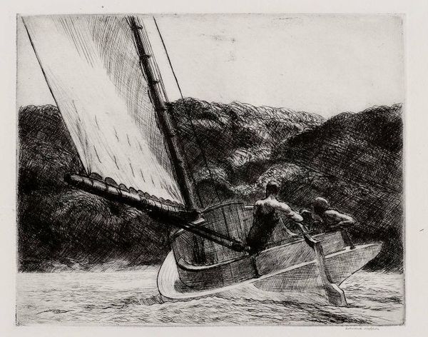 Editor: So, this is Henri de Toulouse-Lautrec’s “Oceano Nox” from 1895. It looks like it's a print, possibly a lithograph or maybe just pencil on paper. There’s a solitary figure on what appears to be a ship, rendered in very grainy detail, capturing a somewhat somber scene at sea. What strikes you when you look at it? Curator: Immediately, I think about the means of production and the social context. This piece, crafted through a readily available and reproducible medium like lithography, challenges the elitist perceptions surrounding the "high" art of painting. What about the implications of disseminating art through printmaking? The image captures a solitary figure working, drawing attention to the labor inherent in seafaring. Think about how the materials used and the ease of reproduction impacted access to art, blurring the lines between consumption, labour, and artistry. Editor: That’s an interesting perspective. I was mostly seeing the romanticism, but considering it’s a print does shift things. I guess the choice of printmaking democratizes the artwork, in a sense. How does that change our interpretation of the image of a solitary sailor? Curator: Exactly! Toulouse-Lautrec chose a method that allowed wider access. He's documenting a worker, perhaps from the margins, doing physical labour. Can we therefore not ask ourselves how his production method affects its subject and meaning? Where do we see that echoed throughout other impressionistic works of the era? Editor: So, it’s less about glorifying the sea and more about presenting labor in an accessible format. It definitely changes my perspective. Thank you for pointing that out. Curator: And thank you for noticing this interplay; examining the 'how' and 'why' informs our understanding greatly!